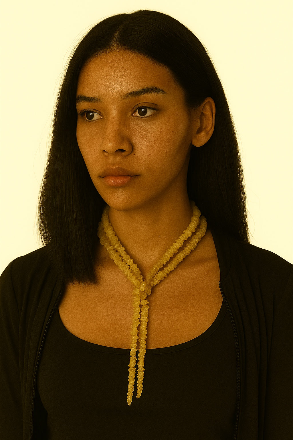 Inspiré par les profondeurs marine ce bijou audacieux marie des éclats de jaune miel dans une silhouette en Y sensuelle et affirmée.